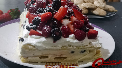 Chiudete la Millefoglie sovrapponendo l’ultimo strato, decorate con la panna appena montata, poi con i frutti misti e servite subito.