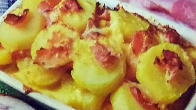 Inburrate una pirofila da forno e iniziate a stratificare adagiando prima le patate, il prosciutto cotto stracciato a mano e la crema di uova e panna. Sovrapponete un secondo strato di patate e traferite in forno a cuocere per 20 minuti a 200 gradi.