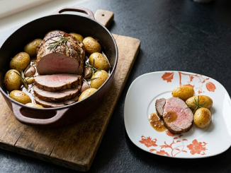 Arrosto di vitello dorato, tagliato a fette morbide e succose, servito con patate novelle al forno leggermente rosolate e profumate di rosmarino. [CONTINUA]