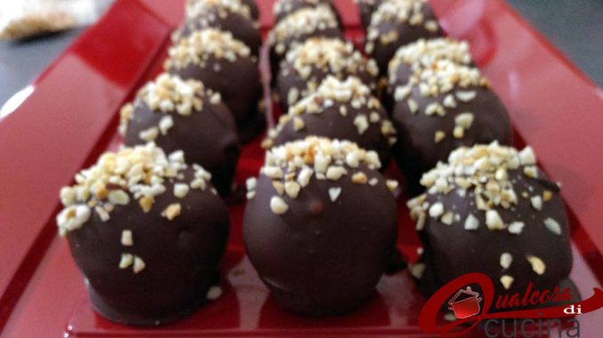 Fate sciogliere il cioccolato a bagno maria o nel microonde per 3 minuti e tuffate ogni Tartufino di pandoro nel cioccolato.